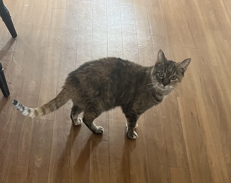 Sugar is an adult female short haired domestic cat weighing about 8lbs. She has distinct tail marking from brown, to white, to a black tip. She is also missing her upper canine tooth.