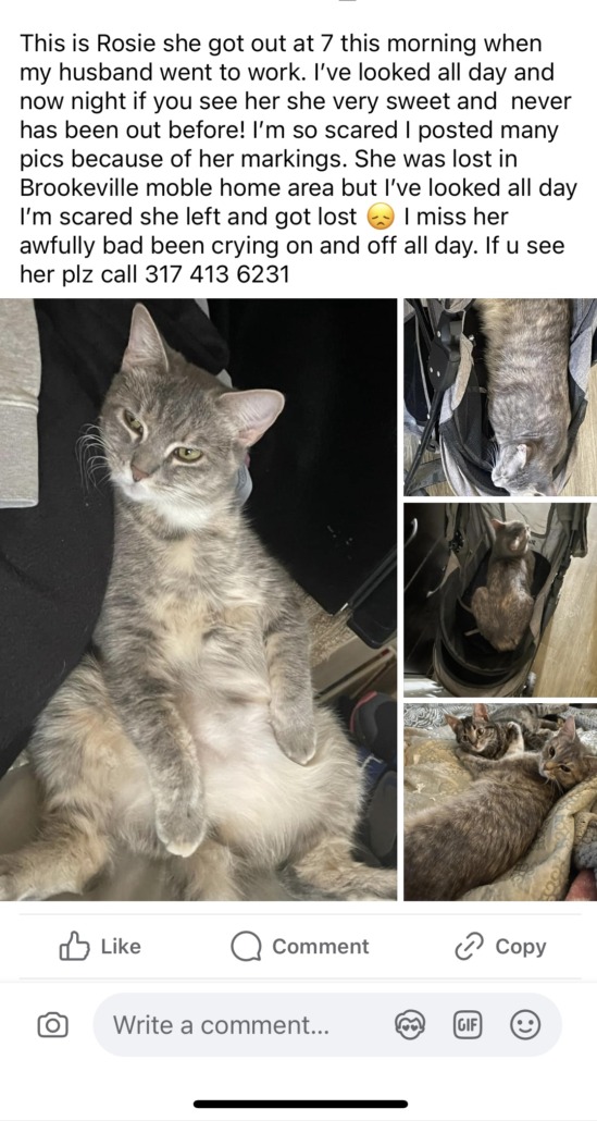 Lost Cat, Alert #72806 Rosie missing near Brookeville and Arlington, Indpls46219