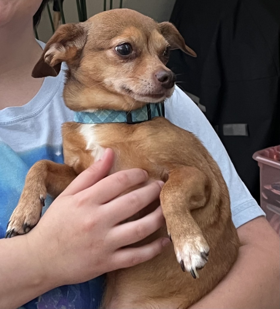 Male chihuahua mix, mostly medium brown coat with a light blue plaid collar. Very energetic, friendly, and cuddly, but does not seem to respond to any common names. No ID. Scanned microchip but it only had the old owner on file who gave him up years ago. Currently boarding him at our house.