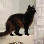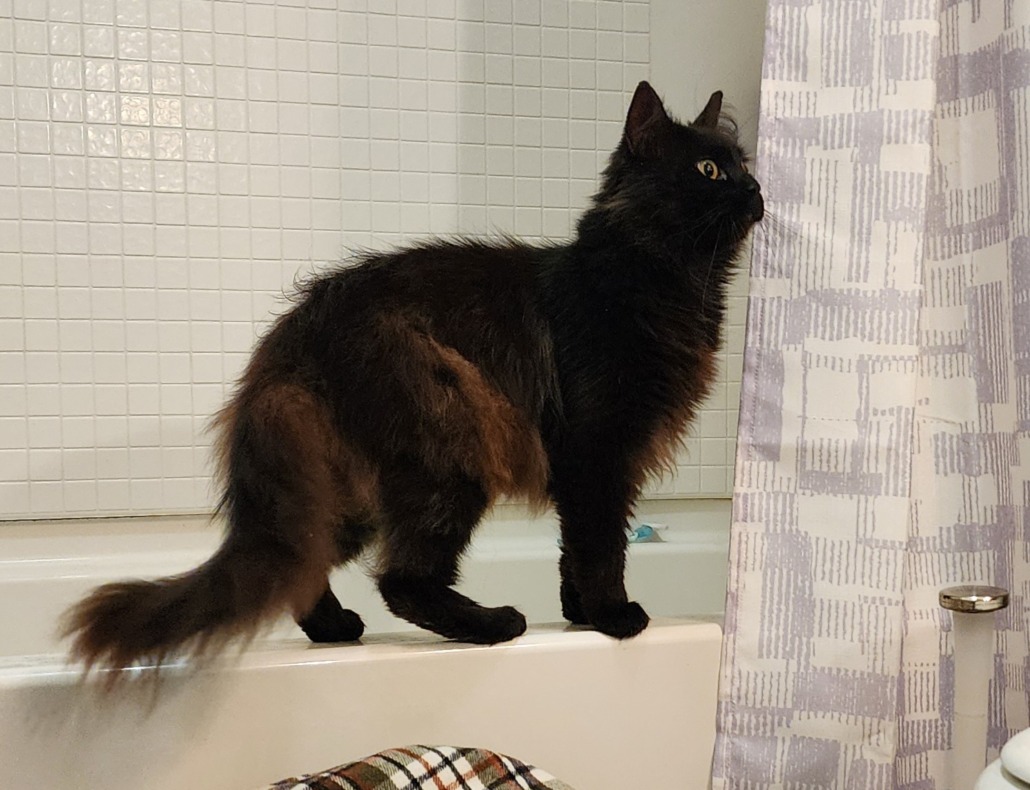 Black long haired friendly cat. Very curious and brave. Fur turns kind of brown at the ends but I think just needs brushed out. Not spots I can see but not looking super close.