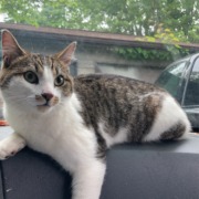 Cat is mostly white on belly and has brown and white mixed fur on the back and tail. There is a hint of orange around the ears
