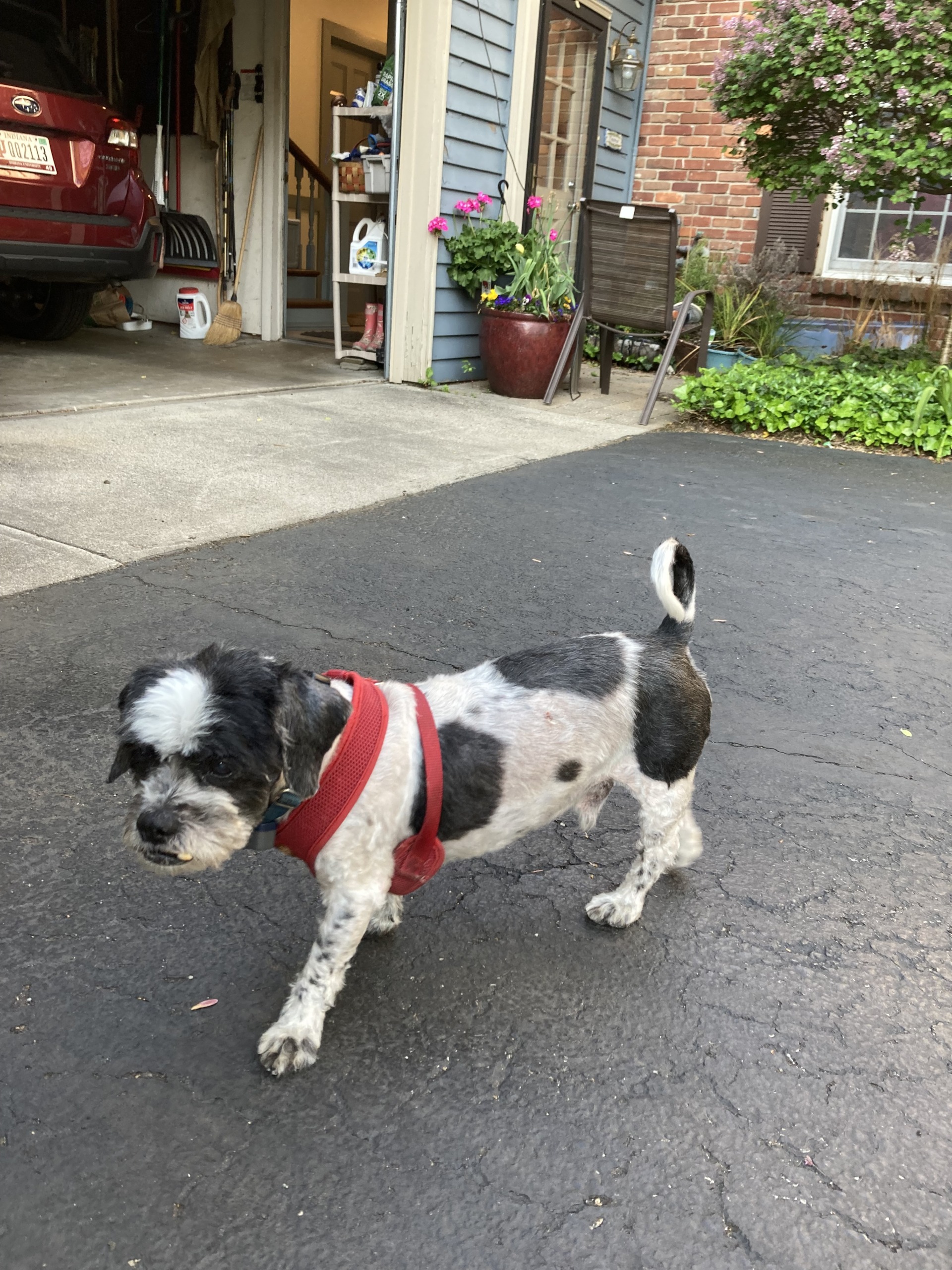 Old schiztzu. His tail is fluffy now and likely does not have collar. He is nearly blind, largely deaf, has dementia and is quite lame. But we love him. He is social but skittish with strangers. But he won’t harm you.