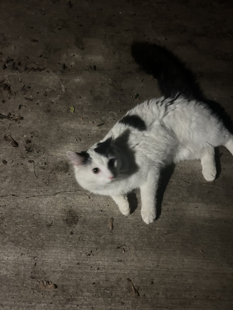 Super friendly and has been sticking around for 30 minutes. White with black tail, ears and spot on side.