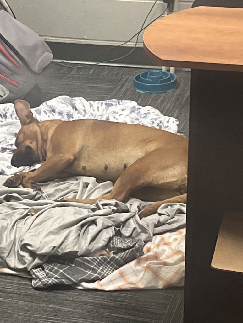 Medium sized tan dog. Very sweet and shy. Looks like she was pregnant or is pregnant. Found her on Coffin golf club parking lot.