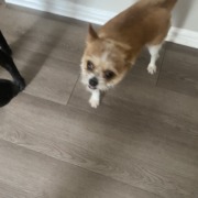 Really small scared dog. Was walking my dog and found her scared running in traffic and finally caught up to her and carried her the whole way home. She’s really sweet.I have 2 dogs of my own and my male is wanting to sniff her but he’s way too big so I had to lock her in my room and she’s scratching at my door like she wants out. Ive done 5 laps in my apartments and no one is even out looking for a dog.