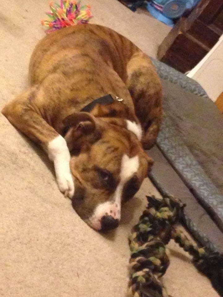 Very friendly older dog, brindle, with white paws and a lot of white on his face as he’s older. He is very friendly, his name is Dizzy. He was my brothers dog that passed away. Dizzy takes medication daily!