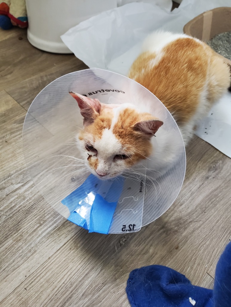 Injured male cat found, approximately 4 years old. Has received medical attention and is resting at my home. Primarily white with some orange. He was wearing a collar but was removed. Proof of ownership is required.