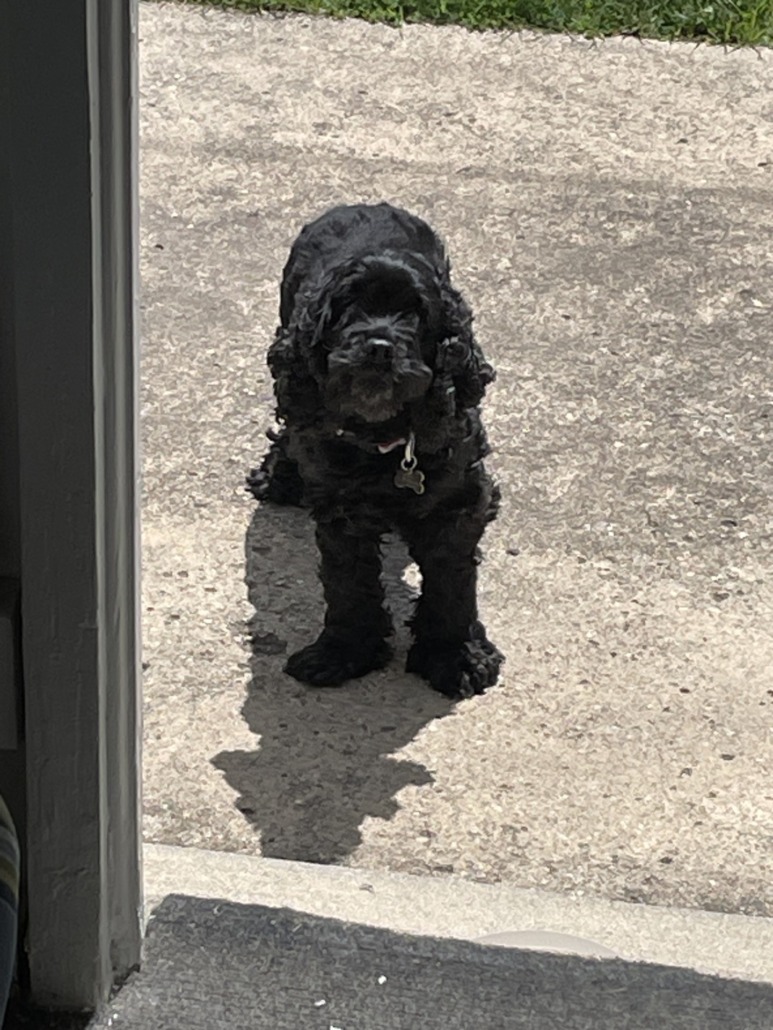 Small black dog with curly hair. Maybe Cocker Spaniel or poodle-mix. Proof of ownership is required.