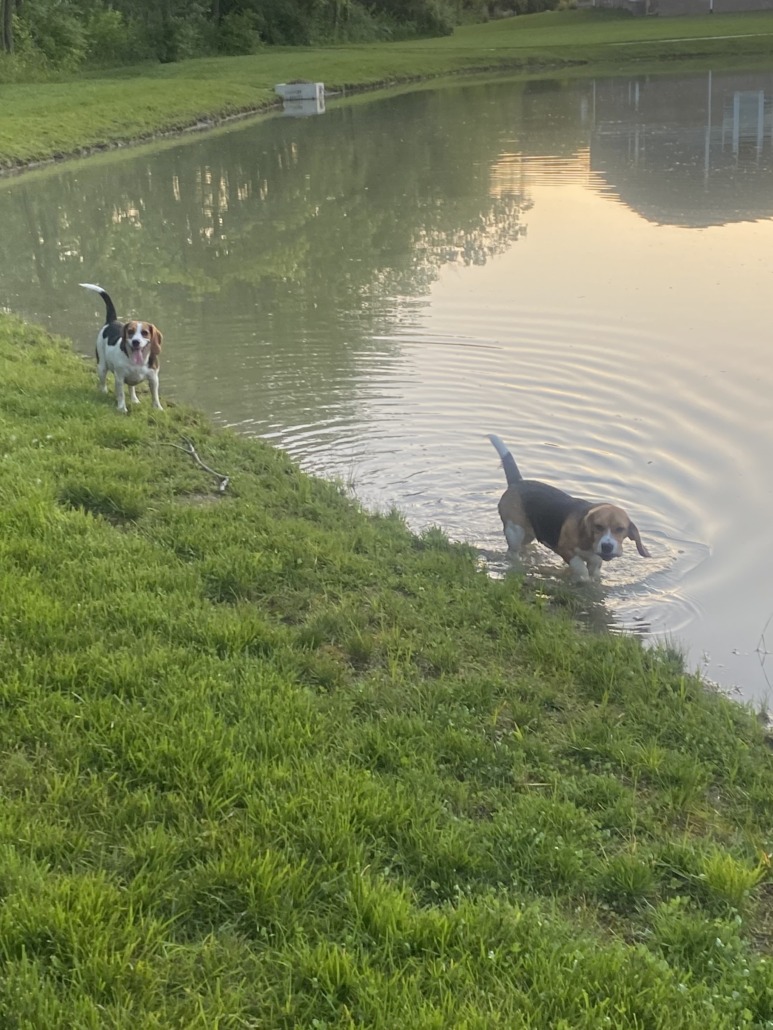 Two beagles in the wooded area of stone creek neighborhood off of Arlington between country line and stop 11. They allowed me to approach, but would not come up to me and did not have collars. They ran back into the wooded area.