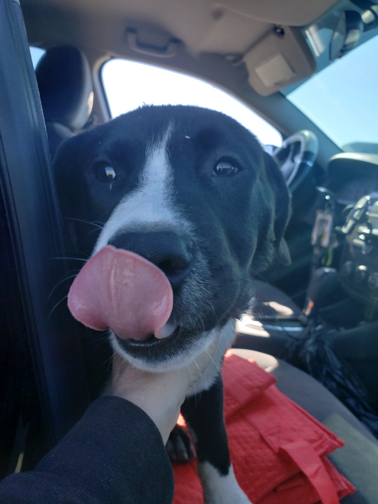 Blk and white pit puppy with blue harness