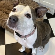 White & grey female pit bull. Very friendly. No name tag and no microchip. Proof of ownership required