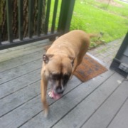 Brown with a black mask. Looks like a boxer or a boxer mix