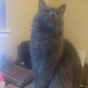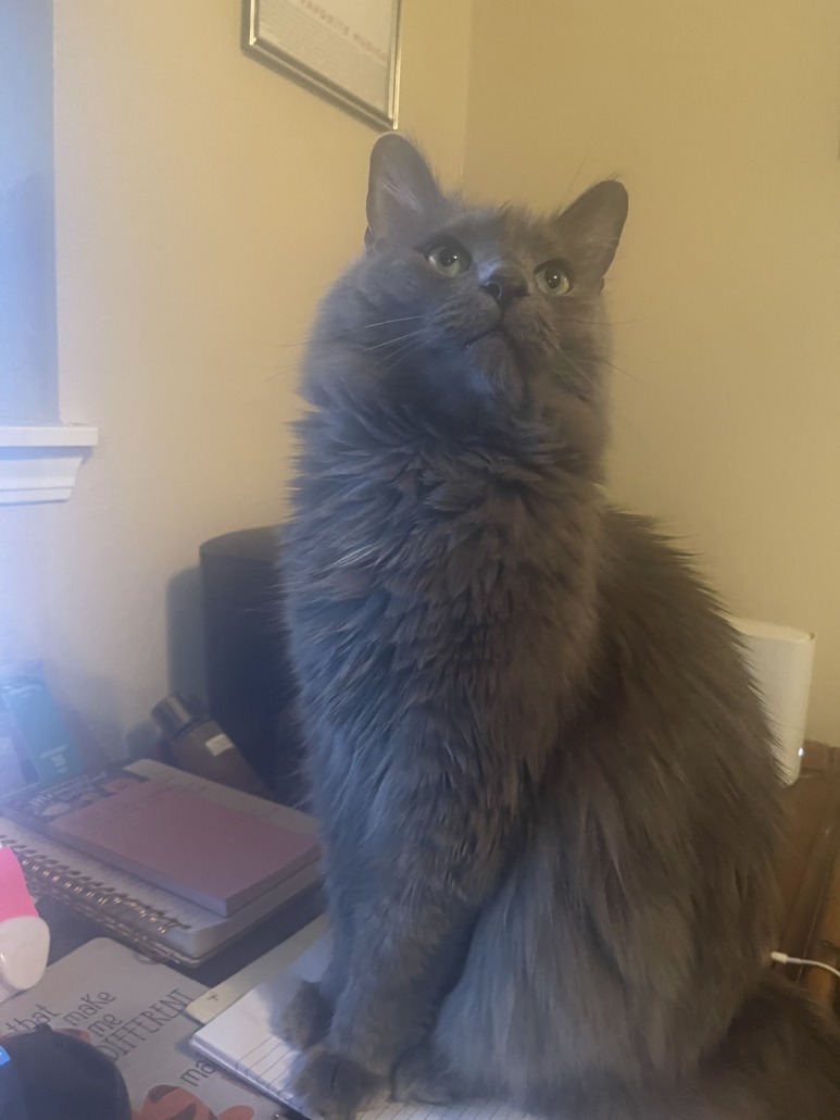 Harry is a big grey cat. He doesn’t have a collar on because he is strictly an indoor cat.