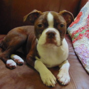 She is 5 months old Boston Terrier. Brown and white (brindle coat). Two front legs are white. She is 13 lbs