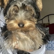 Black and gold Yorkie, about 4-6 lbs had a teal collar on with no tag on it.