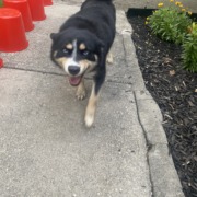 Small/medium black dog with white and tan accents. SUPER sweet. No tags on blue collar. Ran off while I went to get water for it to drink. It was chasing a small yellowish dog and they seemed to be friends.