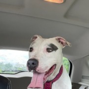 I saw this dog get dumped and pushed away but I’m posting him in case he was stolen or some other circumstance. He’s mostly white with some gray and brindle patches. Very sweet, very friendly. He was waiting patiently at the spot he was dumped when I looped back to get him.