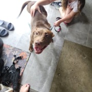 Dog is red nose pit mix . Still a puppy. Nails are groomed. Looks very well taken care of. Ran into my garage out of breath. I walked it around my neighborhood and no luck. Very friendly