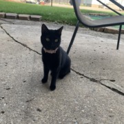 black cat, green eyes, white spot on chest and belly, pink sparkly diamond collar.