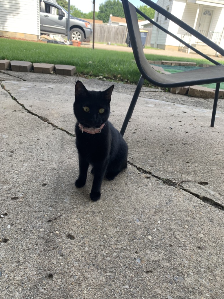 black cat, green eyes, white spot on chest and belly, pink sparkly diamond collar.