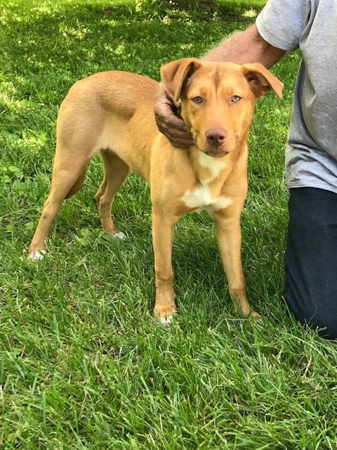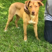 Female. Approx. 1yr old. 30 lbs. reddish gold color. Very sweet and friendly.