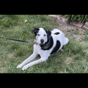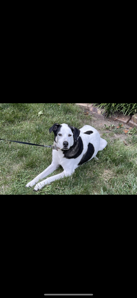 White and black spotted girl dog. About 60 pounds