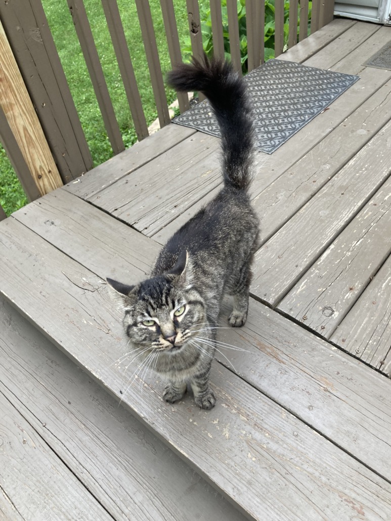 Pleasant cat, declawed, seems like it should be someone’s house cat. We were seeing it occasionally ant first, but now it’s hanging around the house a lot.