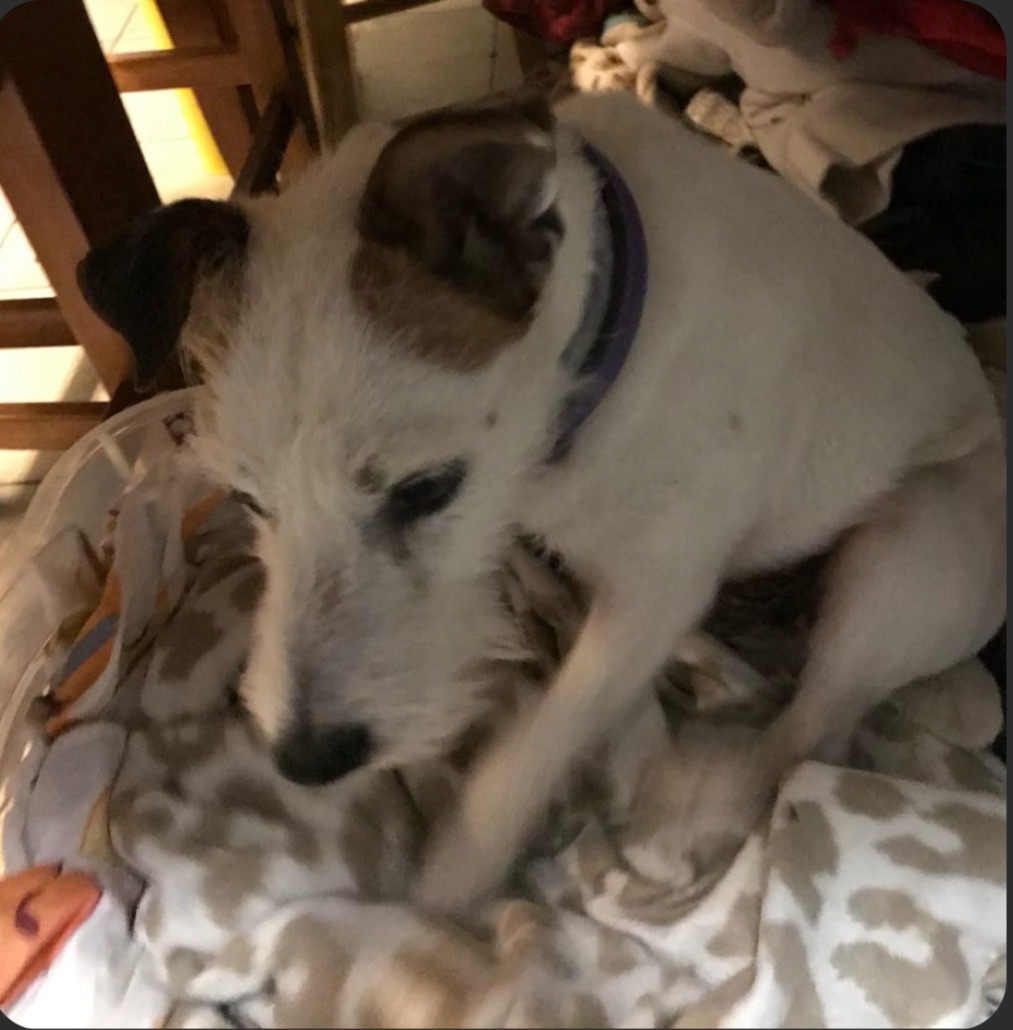 Wire hair Jack Russel Terrier. Mostly white with brown ears.