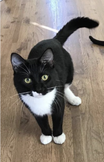 Tuxedo cat. Very Friendly. Loves food and being pet. If you shake a bag of food, he will run to you thinking it’s a treat.