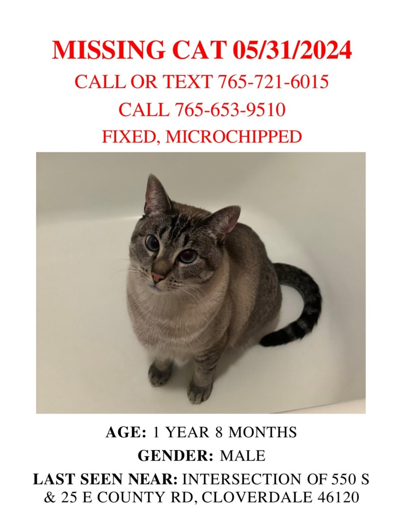 Lost Cat, Alert #73752 Leo missing near 550 south & 25 east county road, Cloverdale, IN46120