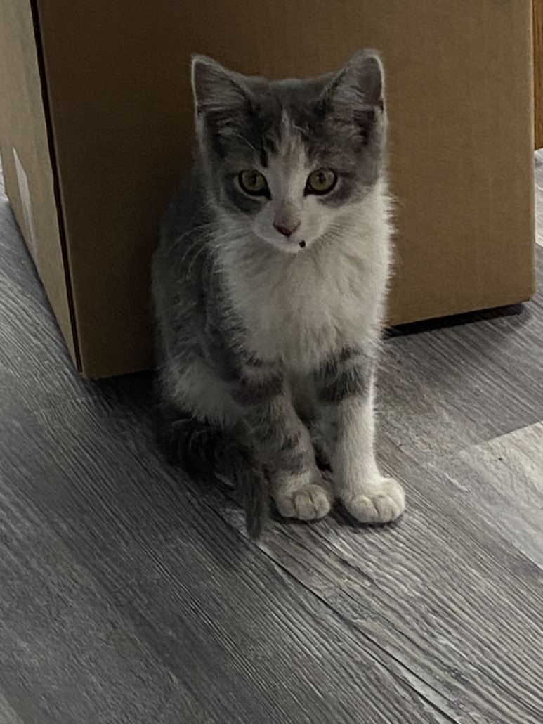 Matted fur, skin tag on lower lip, grey and white tuxedo(?) cat, orange/yellow eyes