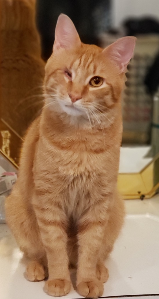 Orange tabby w a missing eye.