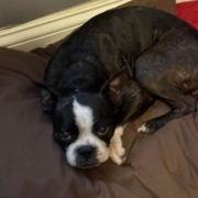 Boston terrier female recently had pups. Came up to my door trying to get in. Laid down on my front porch I let her in and gave her water