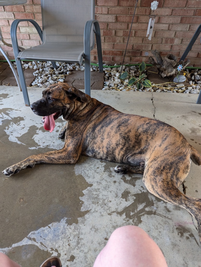 Brindle male extra large dog with chocker chain collar. Proof of ownership required to pick up.