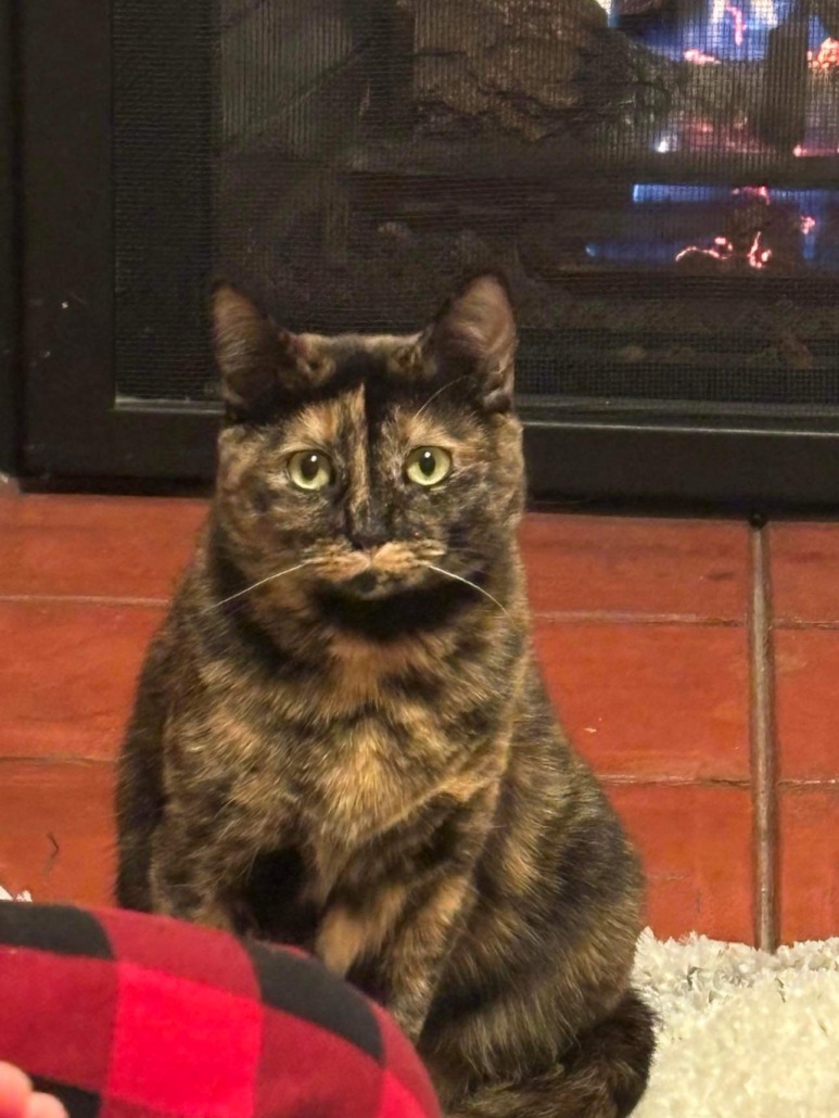 Calico Tortoise, back paws are lighter and white tip to her tail. Yellow eyes. White patch above mouth