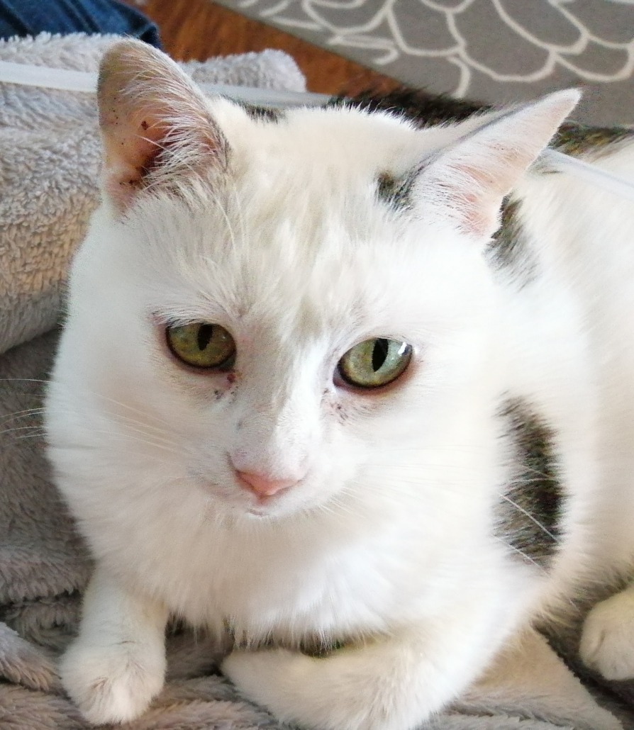 Fable is a petite cat with white fur and spots of blackish/gray. She has green eyes. Her front paws are declawed. Very cuddly and friendly. She has never been outside and is probably very afraid.