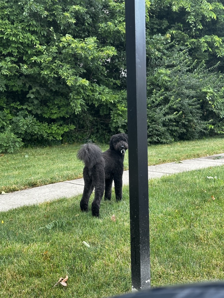 Black doodle or poodle? Very well groomed. EXTREMELY thirsty. In the Wolf Run subdivision