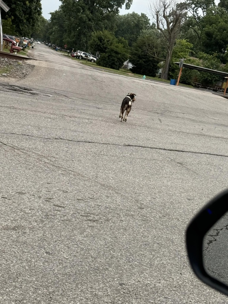 Medium tricolor dog crossed Ky Ave at Mars Hill street. Almost got hit!!