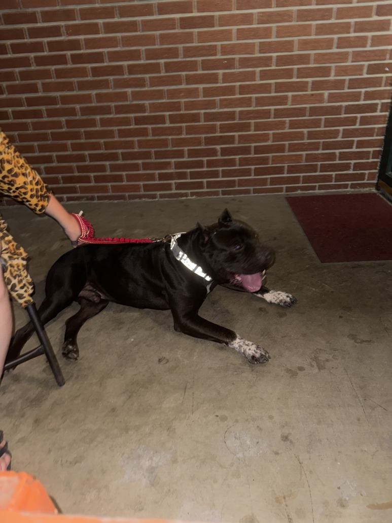 Black male with front white paws with black spots, docked ears very friendly well behaved. does not appear to be neutered. I think it’s a pitbull. He has a gray reflective collar on with a paint splatter pattern no tags.