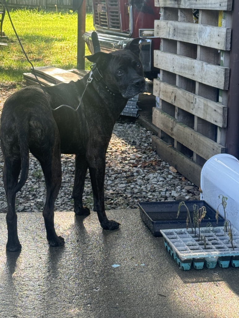 Brindle female dog. Seems to have some eyesight issues. Proof of ownership required