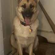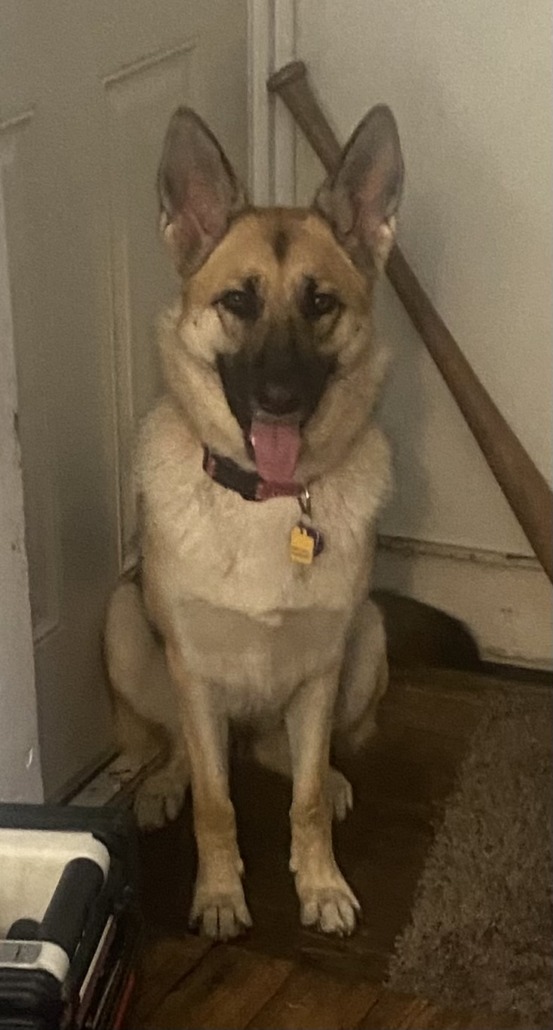 Is a German Shepherd. Brown and black color with white belly. Is wearing a pink collar with my phone number on it. Answers to Kara.