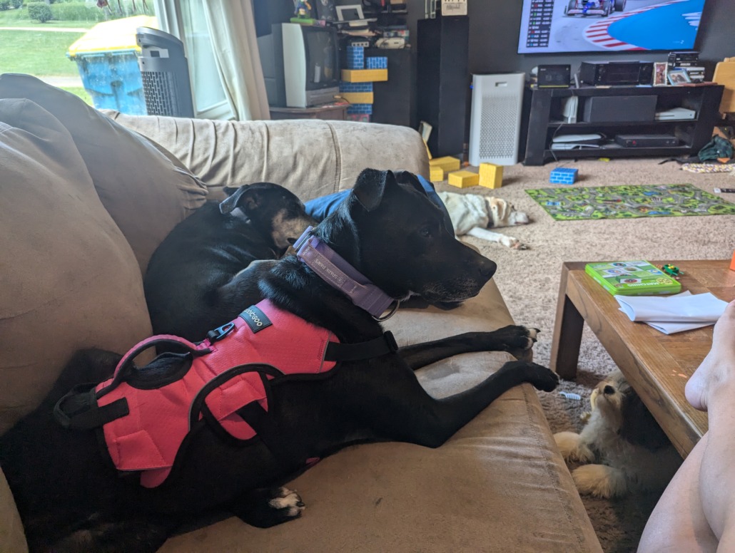 Small-medium black dog with white chest patch that is dyed purple. She is wearing a pink harness and purple collar. Very sweet and cuddly. Loves treats. Is not a cat fan.
