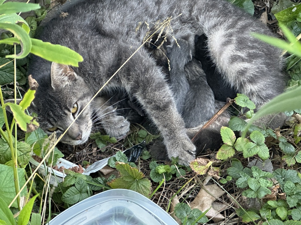 We found her next to our garage and assume she had just had the kittens either that morning or the night before.