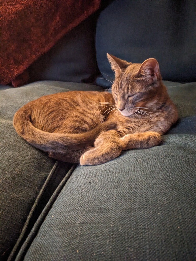 Small, slim, grey tabby, friendly, voice breaks when she meows, large ears.