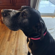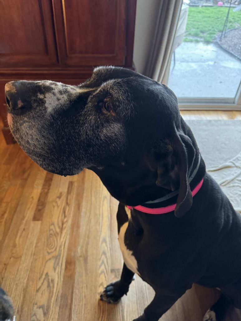 Willow is a large Great Dane with white on her check and legs. She is wearing a hot pink collar with her name and phone number on it and is chipped. She is likely scared and will not come to anyone.