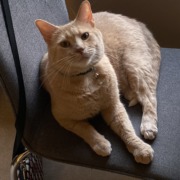 Leo is a medium-sized tan cat with green collar. He is social but also skittish around loud noises and most men. He loves cat treats (and eating in general).