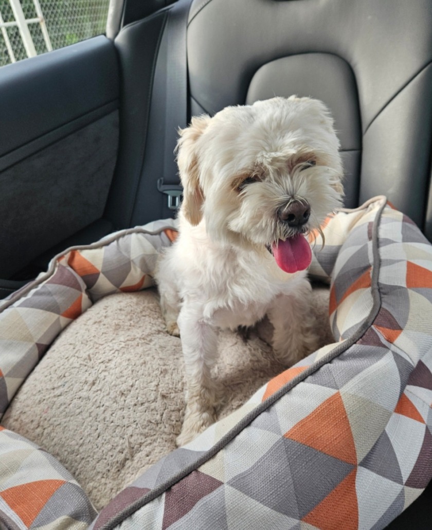 Small white dog with a light brown spots on both ears. She had a pink collar with rhinestones. She’s very friendly and has not barked at all. I went to ‘Airport Animal Emergi-Center’ in to find out if she is microchipped and she is not…hope to find her owners soon!