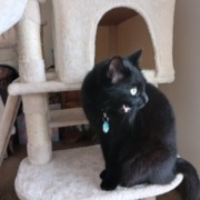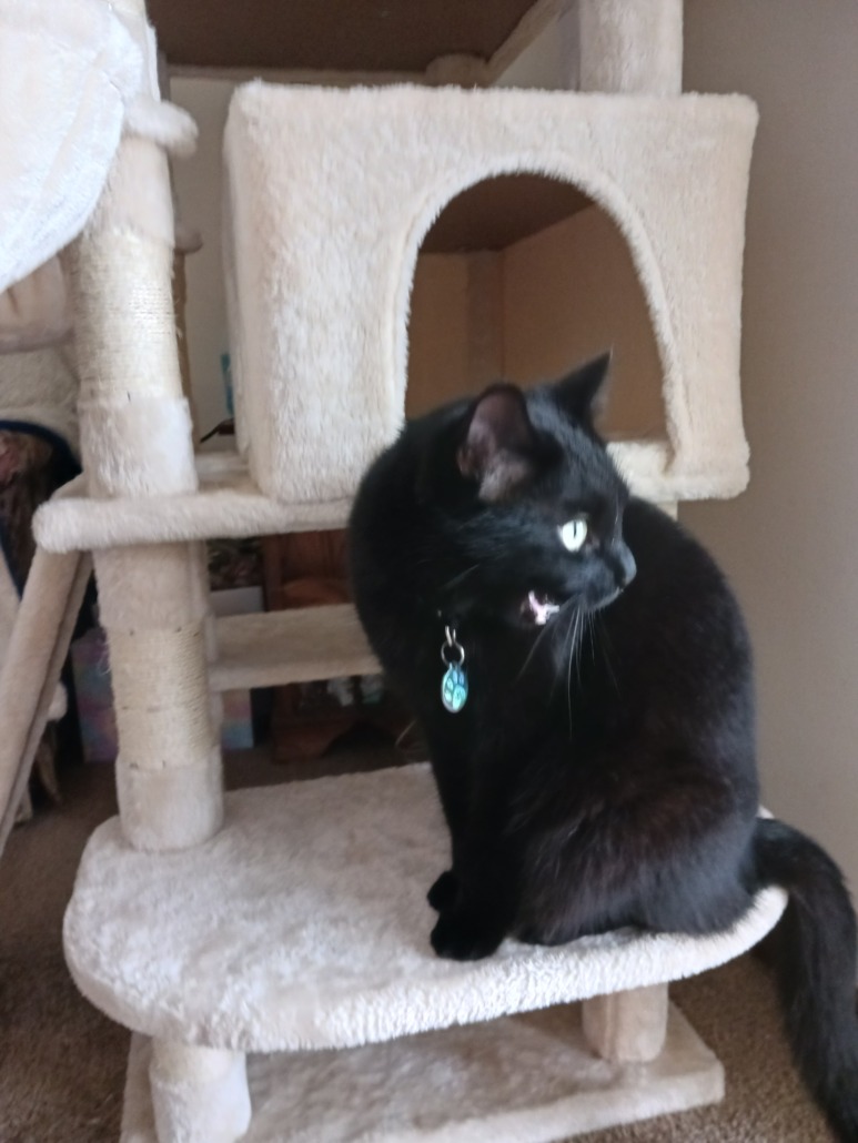 Completely black, NO white. Pink leather buckle collar. Gold and black eyes. Microchipped.