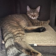 Medium sized female tabby. Resembles a pixie bob with a full length tale. Skittish. No collar because her sister pulls it off during play.