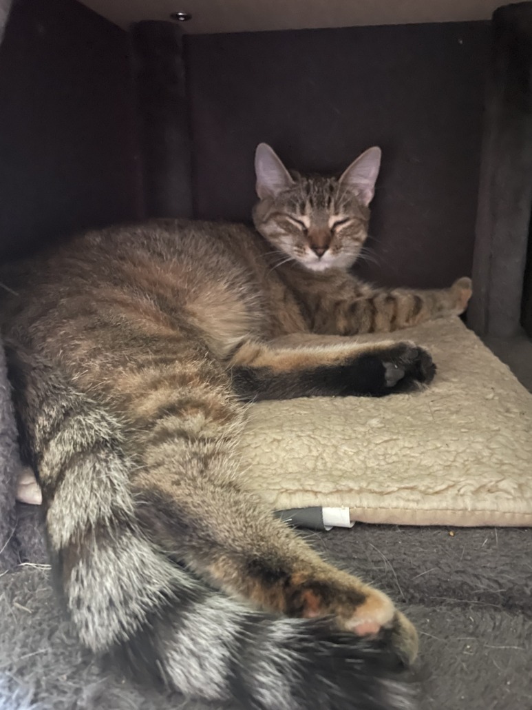 Medium sized female tabby. Resembles a pixie bob with a full length tale. Skittish. No collar because her sister pulls it off during play.